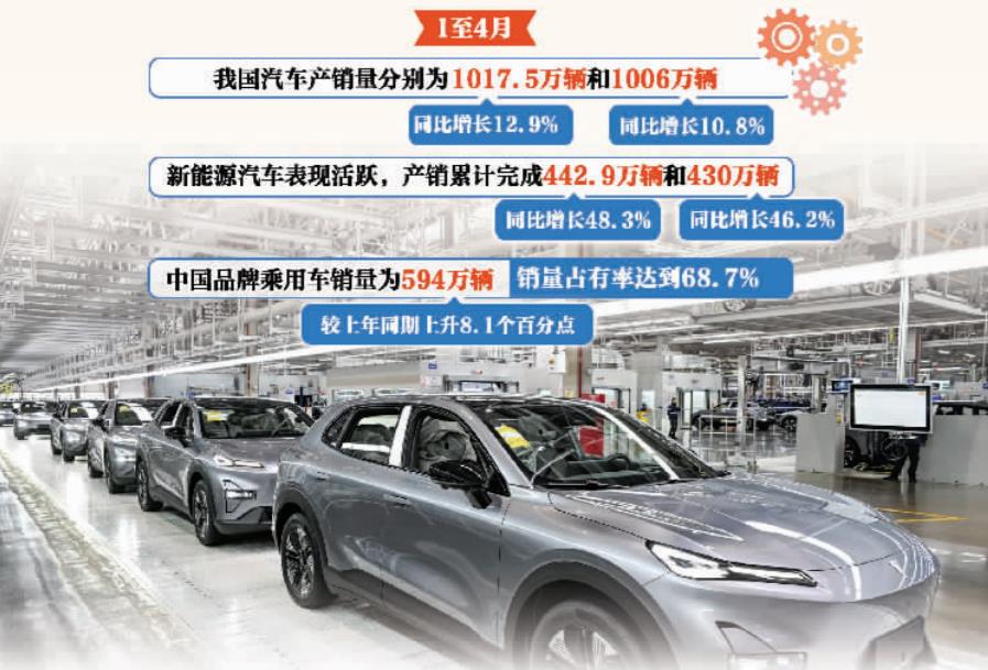 乘用车市场延续良好表现。1至4月,中国品牌乘用车销量为594万辆,销量占有率达到68.7%,较上年同期上升8.1个百分点。4月单月,中国品牌乘用车销量占有率超过70%。